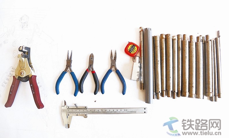 吳金磊的工具盒里,有繞線機、游標卡尺、剝線鉗、斜口鉗、平口鉗等,還有17個特別的繞線棒,直徑在4毫米到20毫米,它們的端頭都鉆著一個小孔,方便插入線頭。利用繞線機和繞線棒,可繞制出彈簧樣的組件,這些組件因粗細、疏密、大孝組合不同,形成千姿百態的圖案。