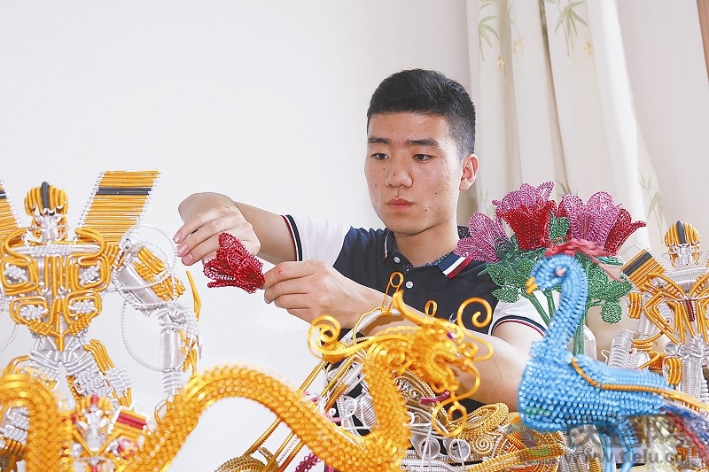 從銅線到鋁線,從竹筷到細網線,吳金磊一步步摸索著,一件件試驗著,到大學時,他做的手工藝品已小有名氣,在學校舉辦的大學生才藝展示上獲得了二等獎,同學們給他起了個綽號 “鐵絲吳”。隨后,他開了自己的網店,周末去鬧市擺攤賣作品。